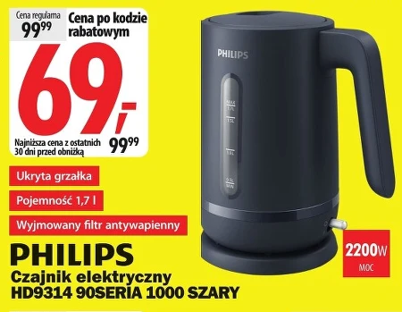 PHILIPS Czajnik elektryczny HD9314 90SERIA 1000 SZARY Ukryta grzałka Pojemność 1,7 l Wyjmowany filtr antywapienny