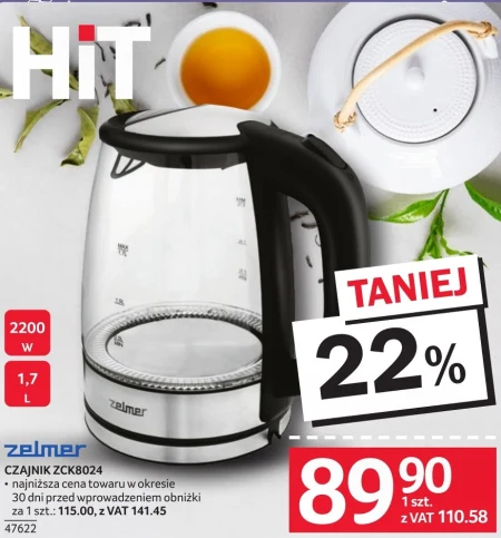 zelmer CZAJNIK ZCK8024 · najniższa cena towaru w okresie 30 dni przed wprowadzeniem obniżki za 1 szt .: 115.00, z VAT 141.45 47622