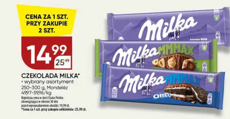 CZEKOLADA MILKA • wybrany asortyment 250-300 g, Mondelez 49,97-59,96zł/kg CENA ZA 1 SZT. PRZY ZAKUPIE 2 SZT. 14,99 Klasyczna czekolada Milka dostępna w ulubionych wariantach smakowych, teraz w promocyjnej cenie przy zakupie dwóch tabliczek. Idealna do dzielenia się z bliskimi, słodkiego podwieczorku z kawą lub jako dodatek do deserów, takich jak Chata Polska – ciasta i wypieki nabiorą dzięki niej wyjątkowego smaku. Czekolada w gramaturze 250-300g to doskonały wybór zarówno dla tych, którzy lubią mniejsze przyjemności, jak i dla miłośników słodkości na większą skalę.