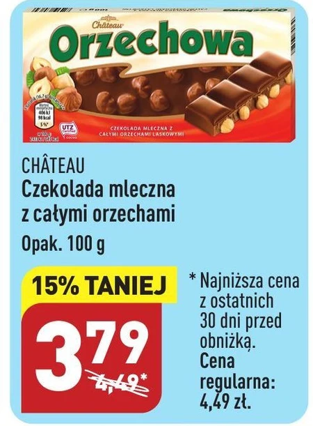 Czekolada mleczna Chateau: 100 g. Najniższa cena z ostatnich 30 dni przed obniżką: 4,49 zł.