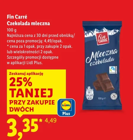 Fin Carré Czekolada mleczna 100 g Najniższa cena z 30 dni przed obniżką/ cena poza promocją: 4,49/opak. * cena za 1 opak. przy zakupie 2 opak. lub wielokrotności 2 opak. Szczegóły promocji dostępne w aplikacji Lidl Plus.