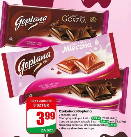 Czekolada Goplana jest dostępna w ofercie Dino w cenie 6,29 zł za sztukę, a przy zakupie trzech sztuk koszt jednej spada do 3,99 zł. Czekolada ma wagę 90 gram i jest dostępna w dwóch rodzajach. To klasyczny słodki przysmak, idealny do kawy, herbaty lub jako drobna przekąska w ciągu dnia. Warto skorzystać z promocji i zaopatrzyć się w ulubione smaki, ponieważ cena jest teraz korzystniejsza niż najniższa z ostatnich 30 dni, kiedy to czekolada kosztowała 5,79 zł. Oferta ważna od 2026-04-08 do 2026-04-14 Źródło: gazetka Dino