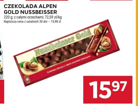 Czekolada Alpen Nussbeisser jest dostępna w ofercie Stokrotka w cenie 15,97 zł za 220 g. To wyjątkowa czekolada z całymi orzechami, idealna jako słodki dodatek do kawy lub jako samodzielna przekąska. Aktualnie jest to jedna z najkorzystniejszych ofert, ponieważ najniższa cena z ostatnich 30 dni wynosiła 15,98 zł. Warto skorzystać z tej okazji, aby cieszyć się smakiem wysokiej jakości czekolady z orzechami.
