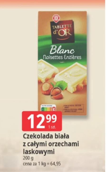Czekolada biała z całymi orzechami laskowymi E.Leclerc jest dostępna w cenie 12,99 zł za 200 g, co daje 64,95 zł za kilogram. Ta słodka przekąska idealnie sprawdzi się jako dodatek do deserów, składnik wypieków lub po prostu do delektowania się w chwilach relaksu. Produkt charakteryzuje się połączeniem kremowej białej czekolady z chrupiącymi, wysokiej jakości orzechami laskowymi. To propozycja dla miłośników słodkości, którzy cenią sobie wyjątkowy smak i aromat. Skorzystaj z okazji i zaopatrz się w tę pyszną czekoladę już dziś.