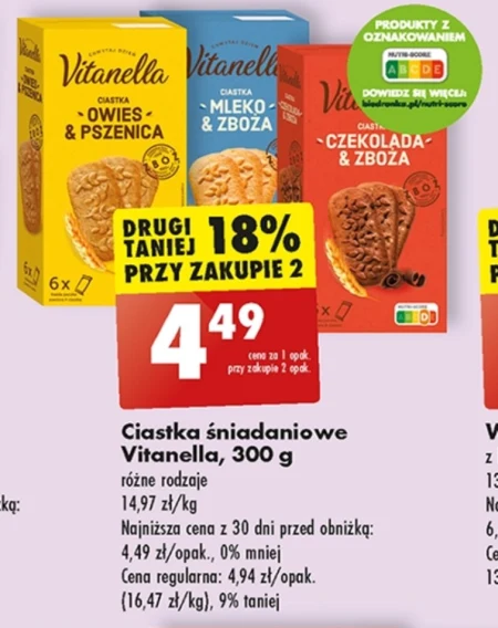 Ciastka śniadaniowe Vitanella, 300 g różne rodzaje 14,97 zł/kg Najniższa cena z 30 dni przed obniżką: 4,49 zł/opak., 0% mniej Cena regularna: 4,94 zł/opak. (16,47 zł/kg), 9% taniej