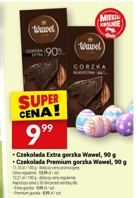 • Czekolada Extra gorzka Wawel, 90 g • Czekolada Premium gorzka Wawel, 90 g 11,10 zł / 100 g - dotyczy ceny promocyjnej Cena regularna - 10,99 zł / szt. 12,21 zł / 100 g - dotyczy ceny regularnej Najniższa cena z 30 dni przed obniżką dla: - Extra gorzka - 9,99 zł / szt. - Premium gorzka - 8,99 zł / szt. Wyjątkowo intensywny smak **czekolady gorzkiej Wawel** sprawia, że idealnie nadaje się do delektowania się podczas chwil relaksu, a wysoka zawartość kakao pozytywnie wpływa na samopoczucie. Doskonała **czekolada Premium gorzka** to propozycja dla smakoszy, którzy cenią sobie bogaty, aromatyczny smak i szukają wysokiej jakości **czekolady gorzkiej**, idealnej do deserów lub jako wyrafinowany prezent. Dzięki zawartości naturalnego kakao, **czekolada Extra gorzka Wawel** to również świetny sposób na poprawę nastroju i dostarczenie sobie energii, a jej intensywny smak sprawdzi się w przygotowaniu **domowych słodyczy** i **ciast**.