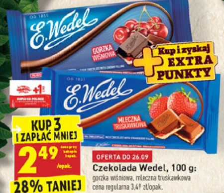 Czekolada Wedel, waga 100 g. Gorzka wiśniowa, mleczna truskawkowa. Kup 3 opakowania i zapłać mniej - 2,49 zł.