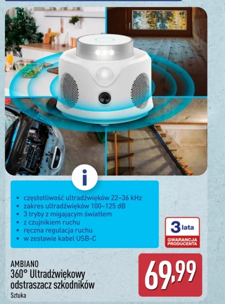Odstraszacz szkodników AMBIANO 360° Ultradźwiękowy dostępny jest w ofercie Aldi za 69,99 zł. Urządzenie skutecznie odstrasza gryzonie i owady dzięki ultradźwiękom o regulowanej częstotliwości oraz trzech trybach pracy z migającym światłem. Wbudowany czujnik ruchu aktywuje odstraszacz automatycznie, a ręczna regulacja pozwala dostosować kierunek działania. W zestawie znajduje się kabel USB-C, a producent udziela trzyletniej gwarancji, co sprawia, że to praktyczne rozwiązanie na dłużej. Sprawdź ofertę, zanim promocja się zakończy. Oferta ważna od 2026-04-22 do 2026-04-25 Źródło: gazetka Aldi