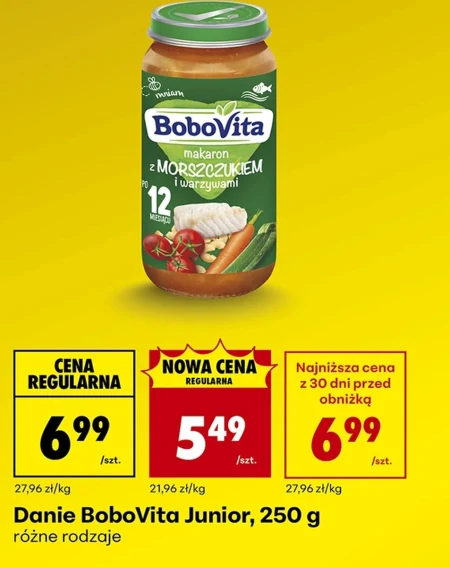 Danie BoboVita Junior, 250 g różne rodzaje Pyszne danie BoboVita Junior to idealny sposób na urozmaicenie diety Twojego malucha, dostarczając niezbędnych składników odżywczych w okresie rozszerzania żywienia. Bogaty skład i delikatna konsystencja sprawiają, że to doskonała propozycja na obiad, zapewniająca zdrowy rozwój dziecka i radość z jedzenia. Wybierając dania BoboVita Junior wspierasz prawidłowe nawyki żywieniowe od najmłodszych lat.