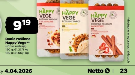 Danie roślinne Happy Vege jest dostępne w ofercie Netto w cenie 9,19 zł za opakowanie o wadze 150 g (61,27 zł/kg) lub 180 g (51,06 zł/kg). To wygodny i szybki sposób na smaczny posiłek bez mięsa, idealny dla osób poszukujących alternatyw roślinnych. Danie może być spożywane na ciepło, jako samodzielny obiad lub dodatek do innych potraw, zaspokajając głód i dostarczając energii. Warto skorzystać z tej okazji i spróbować różnorodnych smaków, które oferuje Happy Vege.