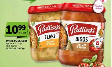 Danie Pudliski, Flaki Wołowe w Rosole dostępne są w ofercie moje sklepy w cenie 18,63-24,42 zł/kg przy wadze 450-590 g. Produkt ten to gotowe danie, idealne na szybki i sycący obiad, przygotowane z wysokiej jakości składników. To propozycja dla osób ceniących tradycyjne smaki i wygodę w kuchni. W moje sklepy znajdziesz również Danie Pudliski Bigos z Mięsem i Kiełbasą w cenie 10,99 zł za sztukę. Bigos to klasyczne danie kuchni polskiej, bogate w smaku i składniki, idealne na chłodniejsze dni. To wygodny sposób na zjedzenie rozgrzewającego posiłku bez konieczności długotrwałego gotowania. Warto zaopatrzyć się w te produkty, jeśli szukasz sprawdzonych dań w dobrej cenie. Oferta ważna od 2026-04-09 do 2026-04-15 Źródło: gazetka moje sklepy