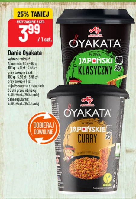 Danie Oyakata wybrane rodzaje* Ajinomoto, 90 g - 97 g 100 g - 4,11 zł - 4,43 zł przy zakupie 2 szt. 100 g - 5,56 zł - 5,99 zł przy zakupie 1 szt. najniższa cena z ostatnich 30 dni przed obniżką: 5,39 zł/szt., 25% taniej cena regularna: 5,39 zł/szt., 25% taniej