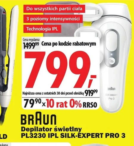 Depilator świetlny PL3230 IPL SILK-EXPERT PRO 3 Braun jest dostępny w ofercie Media Expert w cenie 799,-, dzięki obniżce z ceny regularnej 1499,99. Najniższa cena z ostatnich 30 dni wynosiła 919,99. Urządzenie przeznaczone jest do depilacji wszystkich partii ciała dzięki technologii IPL, oferując trzy poziomy intensywności, co pozwala na dopasowanie zabiegu do indywidualnych potrzeb. Możliwość zakupu na 10 rat 0% RRSO, po 79,90 miesięcznie, czyni tę ofertę wyjątkowo atrakcyjną. Warto rozważyć zakup teraz, aby skorzystać z tej promocji. Oferta ważna od 2026-04-09 do 2026-04-18 Źródło: gazetka Media Expert