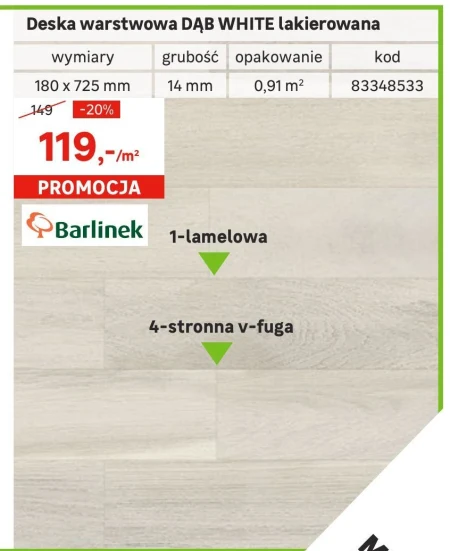 PROMOCJA Barlinek 1-lamelowa Deska warstwowa DĄB WHITE lakierowana grubość opakowanie 14 mm 0,91 m².