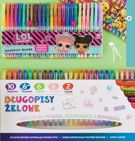 Długopisy żelowe lub markery. Długopisy żelowe, 25 kolorów, w tym metaliczne, pastelowe i brokatowe. Do wyboru różne licencje.