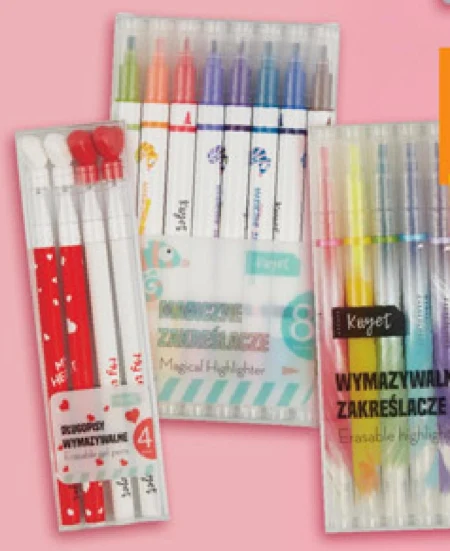 Długopisy wymazywalne 4 sztuki, do wyboru: klasyczny design lub z gumką do ścierania w kształcie serca. Zakreślacze wymazywalne, 8 sztuk: z dwiema końcówkami do zakreślania i wymazywania.
