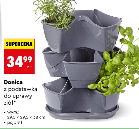 Donica z podstawką Biedronka kosztuje 34,99 zł. Produkt ma wymiary 29,5 x 29,5 x 38 cm i pojemność 9 litrów, co czyni go idealnym do uprawy ziół w domu lub na balkonie. Praktyczna podstawka pomaga utrzymać czystość i chroni powierzchnię przed zabrudzeniami. To propozycja dla osób, które chcą mieć świeże zioła pod ręką i cieszyć się ich aromatem. Skorzystaj z tej oferty i stwórz własną domową uprawę ziół już dziś.