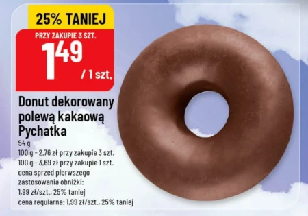 Donut dekorowany polewą kakaową Pychatka 54 g 100 g - 2,76 zł przy zakupie 3 szt. 100 g - 3,69 zł przy zakupie 1 szt. cena sprzed pierwszego zastosowania obniżki: 1,99 zł/szt., 25% taniej cena regularna: 1,99 zł/szt., 25% taniej
