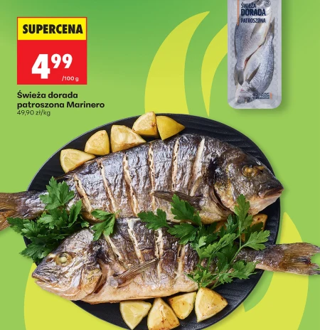 Świeża dorada patroszona Marinero jest dostępna w ofercie Biedronka w cenie 49,90 zł za kilogram, co daje 4,99 zł za 100 gramów. Jest to doskonała propozycja dla miłośników ryb, idealna do przygotowania pożywnych i smacznych dań. Dorada, dzięki swojemu delikatnemu mięsu, świetnie smakuje pieczona, smażona lub gotowana, stanowiąc zdrowy dodatek do obiadu. Skorzystaj z wyjątkowej okazji i zaopatrz się w świeżą rybę w atrakcyjnej cenie. Oferta ważna od 2026-04-29 do 2026-05-06 Źródło: gazetka Biedronka
