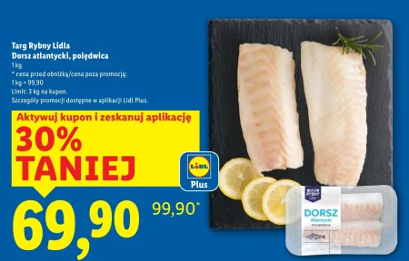 Targ Rybny Lidla Dorsz atlantycki, polędwica 1 kg * cena przed obniżką/cena poza promocją: 1 kg = 99,90 Limit: 3 kg na kupon. Szczegóły promocji dostępne w aplikacji Lidl Plus.