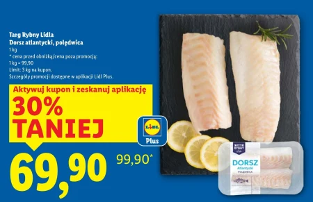 Targ Rybny Lidla Dorsz atlantycki, polędwica 1 kg * cena przed obniżką/cena poza promocją: 1 kg = 99,90 Limit: 3 kg na kupon. Szczegóły promocji dostępne w aplikacji Lidl Plus.