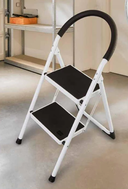 Drabinka dwustopniowa składana. Mocna i stabilna konstrukcja, nogi zabezpieczone warstwą chroniącą przed zarysowaniem powierzchni. Maksymalne obciążenie 150 g.