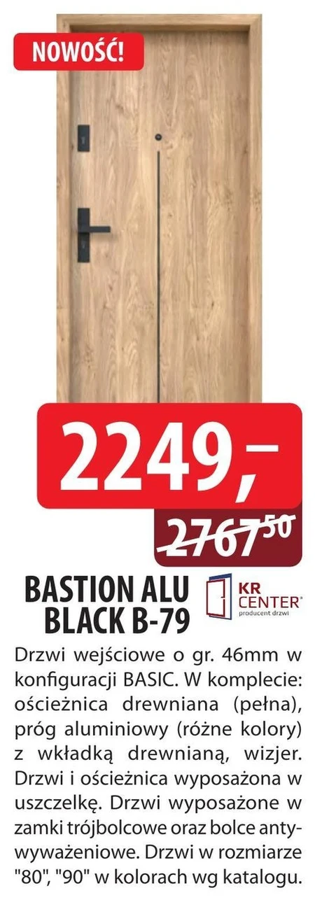 BASTION ALU BLACK B-79 Drzwi wejściowe o gr. 46mm w konfiguracji BASIC. W komplecie: ościeżnica drewniana (pełna), próg aluminiowy (różne kolory) z wkładką drewnianą, wizjer. Drzwi i ościeżnica wyposażona w uszczelkę. Drzwi wyposażone w zamki trójbolcowe oraz bolce anty- wyważeniowe. Drzwi w rozmiarze "80", "90" w kolorach wg katalogu.