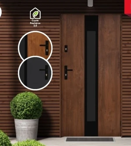 Drzwi zewnętrzne NIL szer. 90 cm, L/P, kolory: złoty dąb szlachetny, orzech szla- chetny, antracyt; wyposażenie: skrzydło, ościeżnica, próg, kpl. akcesoriów; wypełnienie: spieniony polistyren; wykończe- nie: szyba hartowana, ramka czarna, blacha ocynkowana, 3 uszczelki