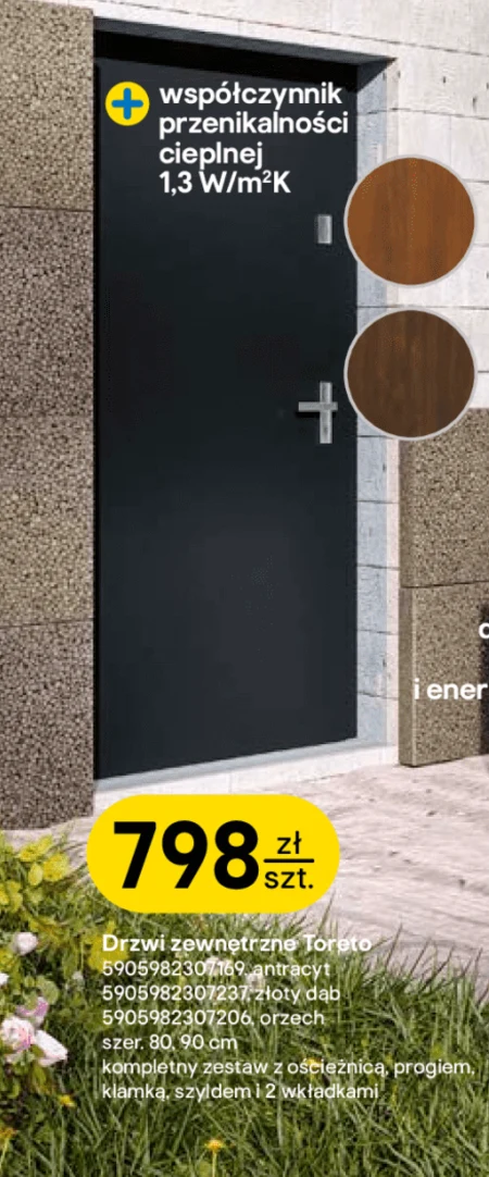 Drzwi zewnętrzne Toreto 5905982307169 antracyt 5905982307237. złoty dab 5905982307206, orzech szer. 80. 90 cm kompletny zestaw z ościeżnicą, progiem, klamką, szyldem i 2 wkładkami
