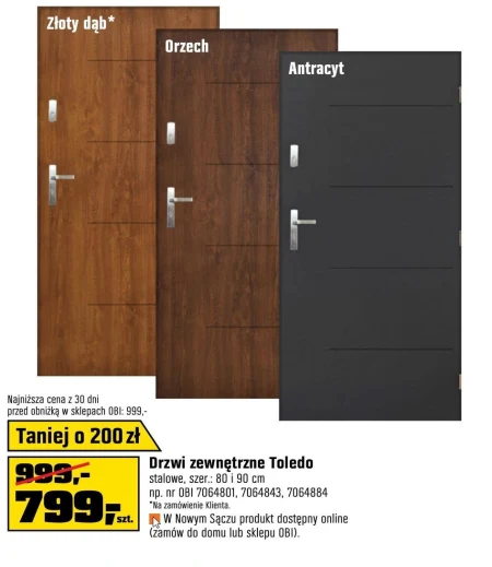 Drzwi zewnętrzne Toledo stalowe, szer .: 80 i 90 cm np. nr OBI 7064801, 7064843, 7064884 *Na zamówienie Klienta. W Nowym Sączu produkt dostępny online (zamów do domu lub sklepu OBI).