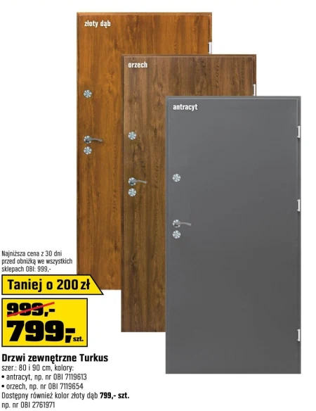 Drzwi zewnętrzne Turkus szer .: 80 i 90 cm, kolory: · antracyt, np. nr OBI 7119613 · orzech, np. nr OBI 7119654 Dostępny również kolor złoty dąb 799,- szt. np. nr OBI 2761971