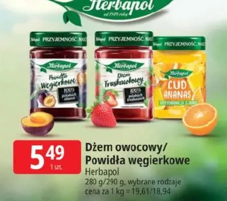 Dżem owocowy/Powidła węgierskie Herbapol w E.Leclerc kosztuje 5,49 zł za słoik o gramaturze 280 g/290 g, w zależności od wybranego rodzaju. Cena za 1 kg w promocji to 19,61/18,94 zł. Produkt idealnie sprawdzi się do smarowania pieczywa lub jako dodatek do wypieków. Oferta dostępna przy zakupie jednej sztuki.