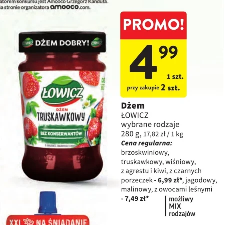 Dżem ŁOWICZ wybrane rodzaje 280 g, 17,82 zł / 1 kg Cena regularna: brzoskwiniowy, truskawkowy, wiśniowy, z agrestu i kiwi, z czarnych porzeczek - 6,99 zł*, jagodowy, malinowy, z owocami leśnymi - 7,49 zł* możliwy MIX rodzajów