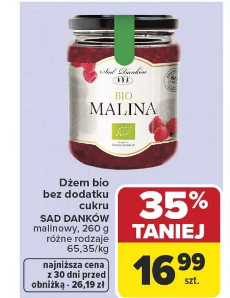 Dżem bio bez dodatku cukru SAD DANKÓW malinowy, 260 g różne rodzaje 65,35/kg