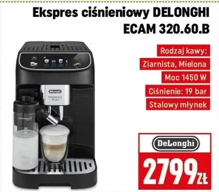 Ekspres ciśnieniowy DELONGHI ECAM 320.60.B Rodzaj kawy: Ziarnista, Mielona Moc 1450 W Ciśnienie: 19 bar Stalowy młynek
