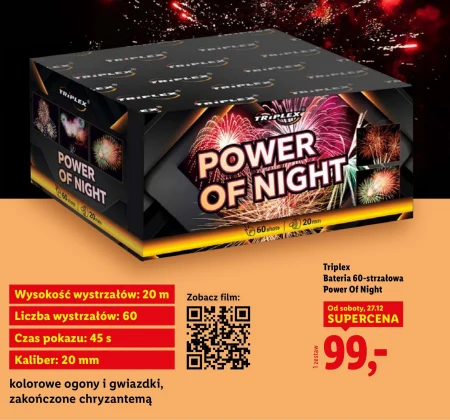 Triplex Bateria 60-strzałowa Power Of Night Wysokość wystrzałów: 20 m Liczba wystrzałów: 60 Czas pokazu: 45 s Kaliber: 20 mm kolorowe ogony i gwiazdki, zakończone chryzantemą