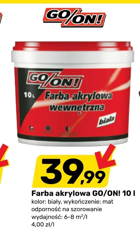 Farba akrylowa GO/ON! 10 I kolor: biały, wykończenie: mat odporność na szorowanie wydajność: 6-8 m2/l 4,00 zł/l