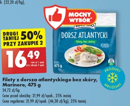 Filety z dorsza atlantyckiego bez skóry, Marinero, 475 g 34,72 zł/kg Cena przed obniżką: 21,99 zł/opak., 25% mniej Cena regularna: 21,99 zł/opak. (46,30 zł/kg), 25% taniej