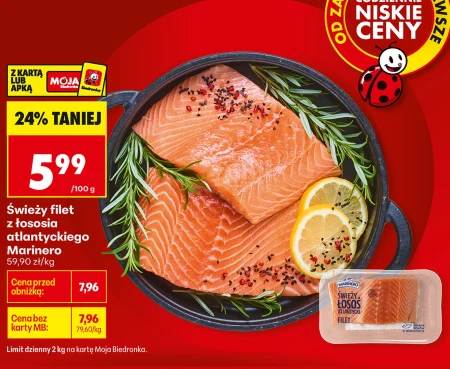 Świeży filet z łososia atlantyckiego Marinero 59,90 zł/kg Limit dzienny 2 kg na kartę Moja Biedronka.