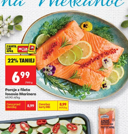 Porcje z fileta łososia Marinero dostępne są w ofercie Biedronka w cenie 69,90 zł za kilogram, a dzięki obniżce 22% można je nabyć już za 6,99 zł za 100 gram. Delikatny filet łososia to doskonały wybór na szybki i zdrowy obiad lub kolację. Można go przygotować na wiele sposobów – upiec w piekarniku, usmażyć na patelni, a nawet dodać do sałatki, by wzbogacić jej smak i wartości odżywcze. Warto skorzystać z tej okazji, ponieważ cena jest wyjątkowo korzystna.