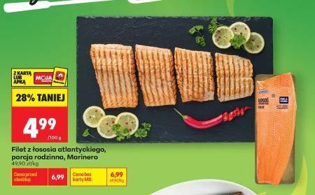 Filet z łososia atlantyckiego, porcja rodzinna Marinero dostępny jest w Biedronce w cenie 4,99 zł za 100 g, co daje 28,90 zł za kilogram, z 28% niższą ceną dzięki karcie lub aplikacji. Ten delikatny i wartościowy filet idealnie nadaje się do przygotowania pysznych i zdrowych posiłków dla całej rodziny, zarówno na co dzień, jak i na specjalne okazje. Można go upiec w piekarniku, usmażyć na patelni lub przygotować na grillu, ciesząc się jego wyjątkowym smakiem i aromatem. Warto skorzystać z tej okazji, ponieważ taka cena za wysokiej jakości łososia atlantyckiego występuje rzadko. Oferta ważna od 2026-04-29 do 2026-05-06 Źródło: gazetka Biedronka