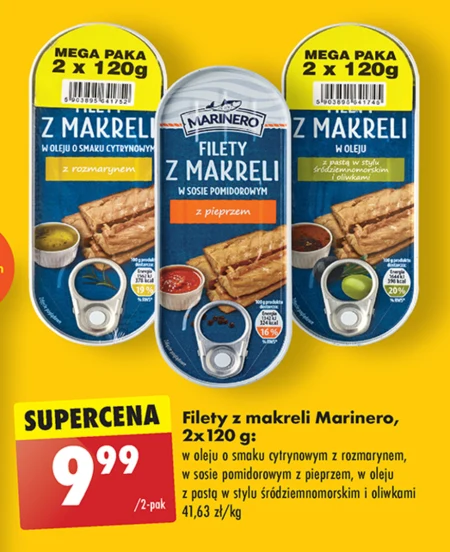 Filety z makreli Marinero, 2x120 g: w oleju o smaku cytrynowym z rozmarynem, w sosie pomidorowym z pieprzem, w oleju z pastą w stylu śródziemnomorskim i oliwkami 41,63 zł/kg