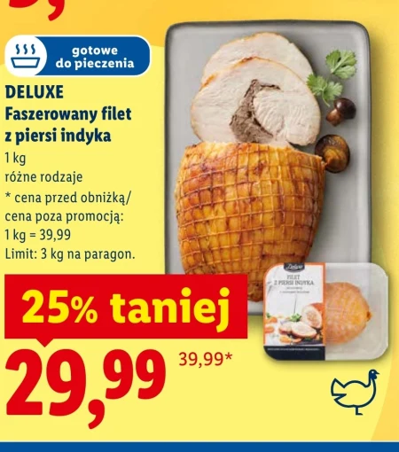 Faszerowany filet z piersi indyka Deluxe w promocji Lidl kosztuje 29,99 za kilogram, co oznacza 25% obniżki z ceny 39,99. Limit zakupu to 3 kilogramy na paragon. Ten smaczny i gotowy do przygotowania produkt to doskonały wybór na szybki obiad lub kolację, a różnorodność rodzajów zadowoli nawet najbardziej wymagających smakoszy. Wystarczy upiec lub podsmażyć, by cieszyć się soczystym i aromatycznym daniem, idealnym zarówno na co dzień, jak i na specjalne okazje – warto skorzystać z tej okazji i zaopatrzyć się w wysokiej jakości indyka w atrakcyjnej cenie.