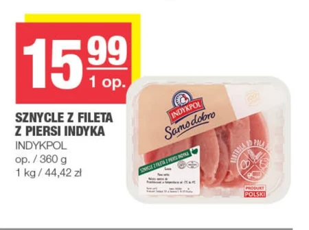 SZNYCLE Z FILETA Z PIERSI INDYKA INDYKPOL op. / 360 g 1 kg / 44,42 zł Delikatne sznycle z piersi indyka Indykpol to doskonały wybór dla osób dbających o zdrową dietę i poszukujących chudego mięsa, idealnego do szybkiego obiadu czy kolacji. Przygotujesz z nich wyśmienite dania, takie jak panierowane sznycle, aromatyczne rolady, czy lekkie sałatki, bogate w białko. Ten produkt to świetna propozycja dla rodzin z dziećmi, a także dla sportowców, którzy cenią sobie wartości odżywcze mięsa indyczego.