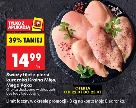 Świeży filet z piersi kurczaka Kraina Mięs, Mega Paka Oferta dostępna w sklepach bez lady tradycyjnej. Limit łączny w okresie promocji - 3 kg na konto Moja Biedronka.
