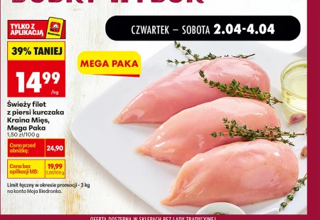 Świeży filet z piersi kurczaka Kraina Mięs w Mega Paczce dostępny jest w ofercie Biedronka w cenie 14,99 zł/kg, co oznacza aż 39% taniej niż cena przed obniżką. Ten produkt to idealna podstawa do wielu zdrowych i smacznych dań – sprawdzi się zarówno w codziennym gotowaniu, jak i podczas specjalnych okazji, pozwalając na przygotowanie lekkich obiadów, pożywnych sałatek czy aromatycznych dań z grilla. Skorzystaj z wyjątkowej okazji i zaopatrz się w wysokiej jakości kurczaka, pamiętając o limicie 3 kg na jedno konto Moja Biedronka, który obowiązuje w okresie promocji – tylko z aplikacją.