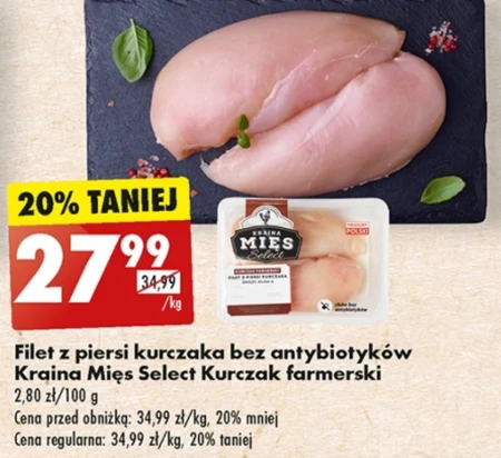 Filet z piersi kurczaka bez antybiotyków Kraina Mies Select Kurczak farmerski 2,80 zł/100 g Cena przed obniżką: 34,99 zł/kg, 20% mniej Cena regularna: 34,99 zł/kg, 20% taniej