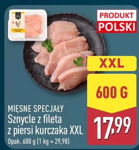 Mięsne Specjały Sznicle z fileta z piersi kurczaka XXL są dostępne w Aldi w cenie 17,99 za opakowanie 600 g, co daje 29,98 za kilogram. Sznicle wykonane z delikatnego mięsa z piersi kurczaka to doskonały wybór na szybki i smaczny obiad, idealne do smażenia lub pieczenia. Ten produkt to świetna okazja, by przygotować pyszne danie dla całej rodziny w atrakcyjnej cenie. Warto zaopatrzyć się w ten produkt, póki jest dostępny w promocji. Źródło: gazetka Aldi