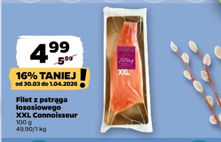Filet z pstrąga łososiowego XXL Connoisseur jest dostępny w ofercie Netto w cenie 4,99 zł za 100 g, co stanowi 16% zniżki z ceny 5,99 zł. Cena za kilogram wynosi 49,90 zł. Delikatne mięso pstrąga doskonale nadaje się do przygotowania różnorodnych dań – można go usmażyć, upiec w piekarniku, ugotować na parze lub przyrządzić na grillu. To wyjątkowa okazja, by spróbować świeżego i smacznego rybnego przysmaku.