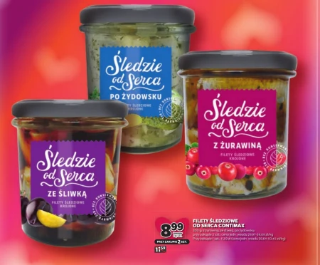 FILETY ŚLEDZIOWE OD SERCA CONTIMAX 500 g z żurawiną, ze sliką, po żydowsku: przy zakupie 2 szt. cena jedni wiadu 29.97-39.09 25/kg Przy zakupie 1 szt .: 11,50 zł (cono jedn, wendu 38,54-50,40 zł/kg)